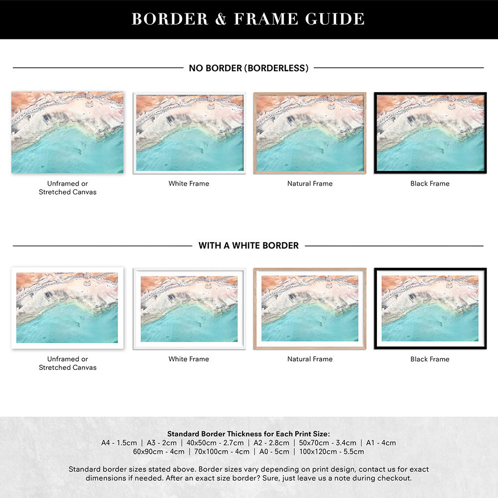 Prints are shown in a frame. If you would like your prints framed, please select a framed option shown. All sizes listed are edge to edge print sizes. If you are purchasing a framed print, please note the final measurement inclusive of the frame will be approx. 4 cm more in height + width than the print size listed. eg- 40 x 50 cm print becomes approx. 44 x 54 cm when framed. Please see our sizing page for help choosing the right size.