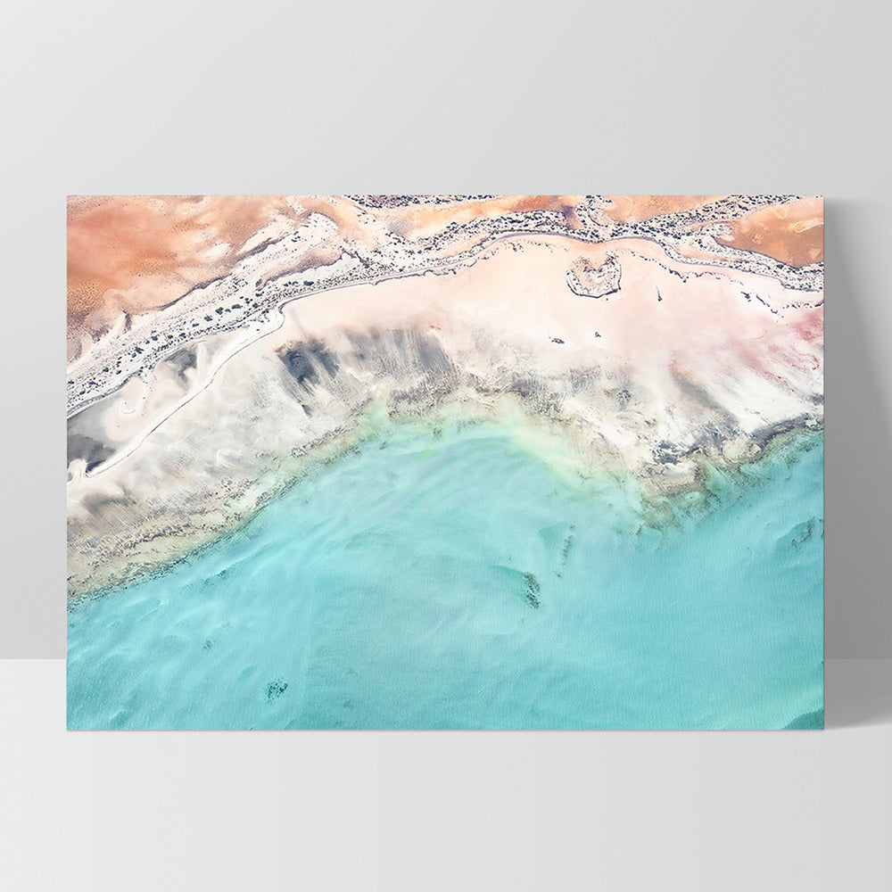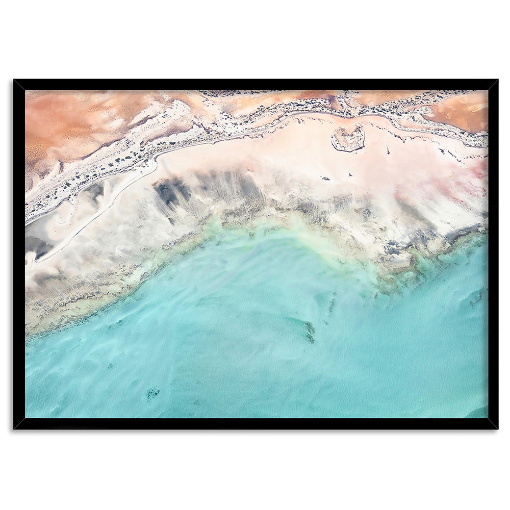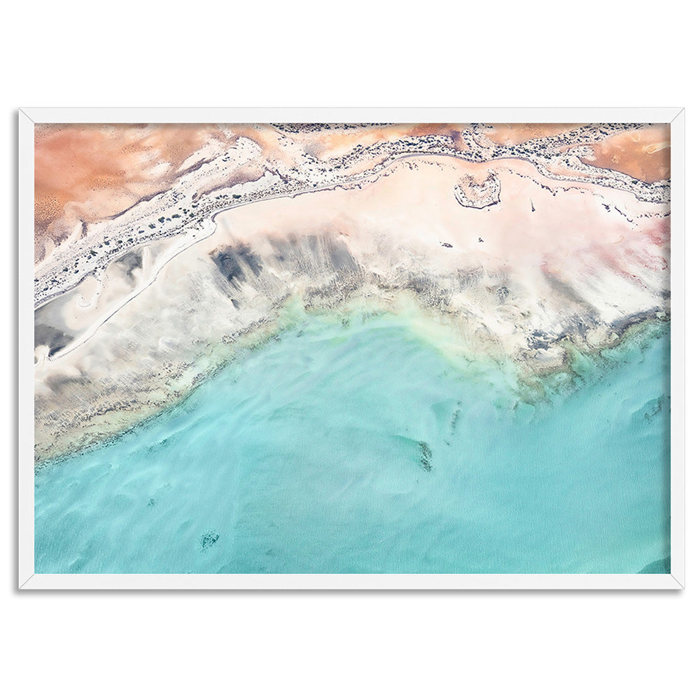 Shark Bay Aerial Beach View III - Art Print, Poster, Stretched Canvas or Framed Wall Art, Showing White , Black, Natural Frame Colours, No Frame (Unframed) or Stretched Canvas, and With or Without White Borders