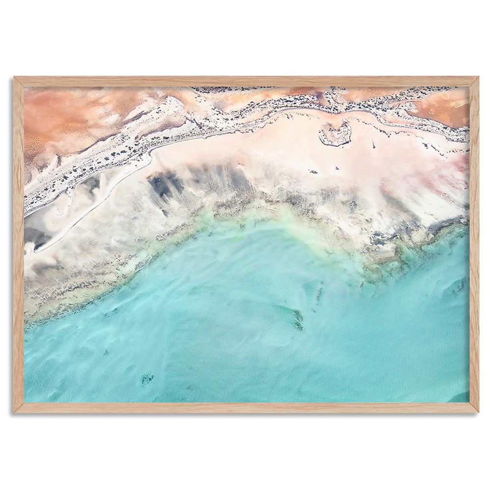 Shark Bay Aerial Beach View III - Art Print, Poster, Stretched Canvas, or Framed Wall Art Print, shown in a natural timber frame