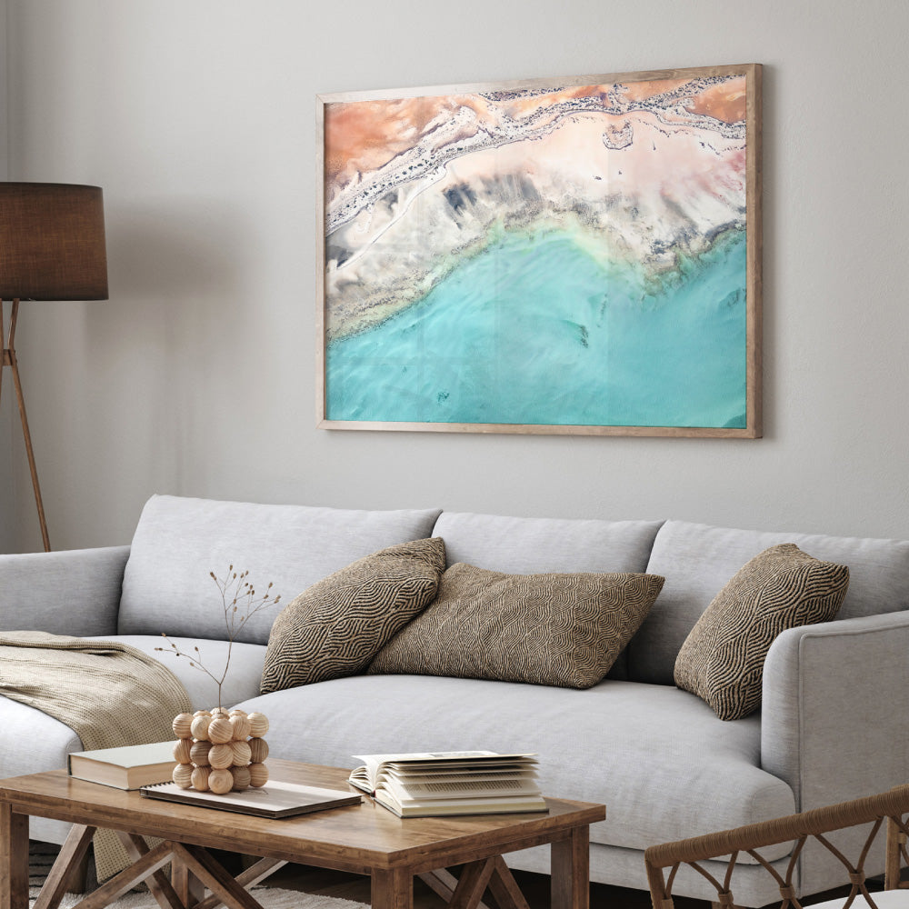 Shark Bay Aerial Beach View III - Art Print, Poster, Stretched Canvas or Framed Wall Art, shown framed in a home interior space