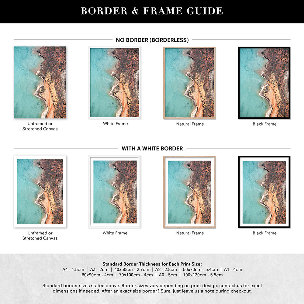 Prints are shown in a frame. If you would like your prints framed, please select a framed option shown. All sizes listed are edge to edge print sizes. If you are purchasing a framed print, please note the final measurement inclusive of the frame will be approx. 4 cm more in height + width than the print size listed. eg- 40 x 50 cm print becomes approx. 44 x 54 cm when framed. Please see our sizing page for help choosing the right size.