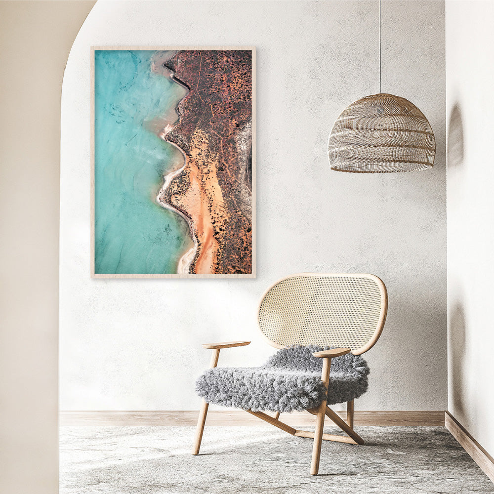 Shark Bay Aerial Beach View VI - Art Print, Poster, Stretched Canvas or Framed Wall Art, shown framed in a home interior space