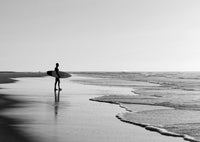 Lone Ocean Surfer B&W II - Art Print, Poster, Stretched Canvas or Framed Wall Art, Showing White , Black, Natural Frame Colours, No Frame (Unframed) or Stretched Canvas, and With or Without White Borders