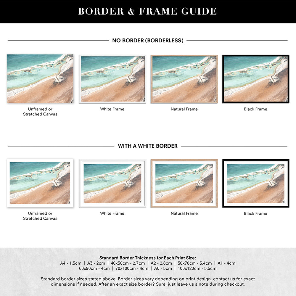 Prints are shown in a frame. If you would like your prints framed, please select a framed option shown. All sizes listed are edge to edge print sizes. If you are purchasing a framed print, please note the final measurement inclusive of the frame will be approx. 4 cm more in height + width than the print size listed. eg- 40 x 50 cm print becomes approx. 44 x 54 cm when framed. Please see our sizing page for help choosing the right size.