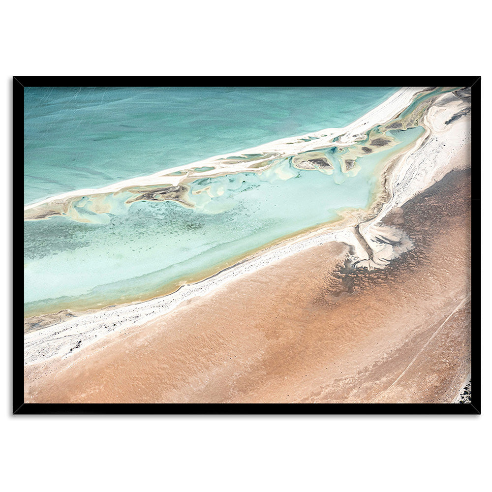Shark Bay Aerial Beach View II - Art Print, Poster, Stretched Canvas or Framed Wall Art, Showing White , Black, Natural Frame Colours, No Frame (Unframed) or Stretched Canvas, and With or Without White Borders