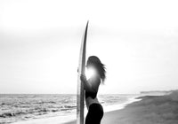 Sunrise Surfer B&W - Art Print, Poster, Stretched Canvas or Framed Wall Art, Showing White , Black, Natural Frame Colours, No Frame (Unframed) or Stretched Canvas, and With or Without White Borders