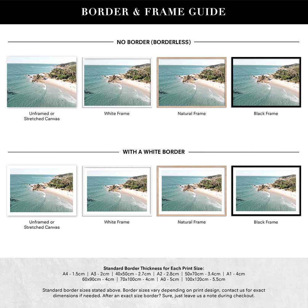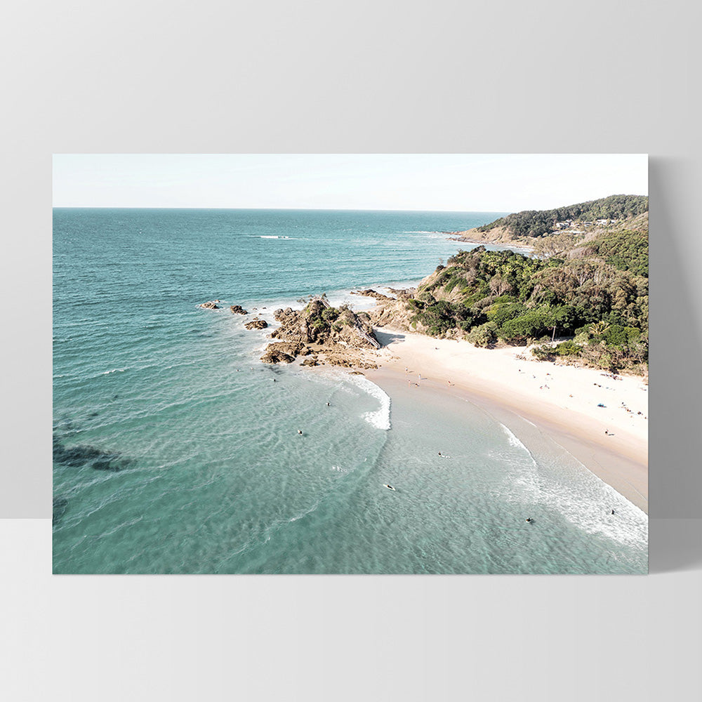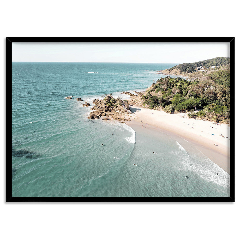 The Pass Byron Bay Aerial - Art Print, Poster, Stretched Canvas or Framed Wall Art, Showing White , Black, Natural Frame Colours, No Frame (Unframed) or Stretched Canvas, and With or Without White Borders