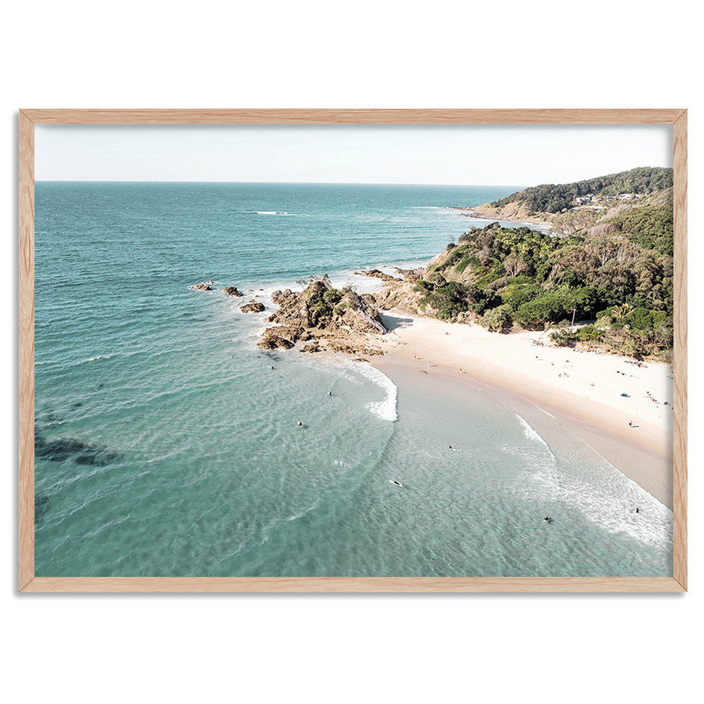 The Pass Byron Bay Aerial - Art Print, Poster, Stretched Canvas, or Framed Wall Art Print, shown in a natural timber frame