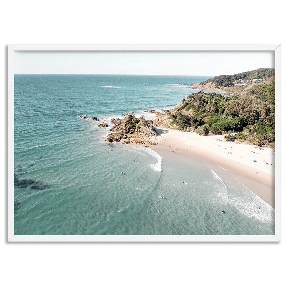 The Pass Byron Bay Aerial - Art Print, Poster, Stretched Canvas, or Framed Wall Art Print, shown in a white frame