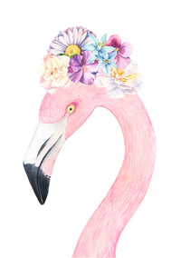 Flamingo in Floral Crown, Watercolours - Art Print