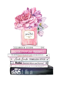 Perfume Bottle on Fashion Books Stack II - Art Print, Poster, Stretched Canvas or Framed Wall Art, Showing White , Black, Natural Frame Colours, No Frame (Unframed) or Stretched Canvas, and With or Without White Borders