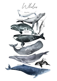 Whales of The World Chart in Watercolour  - Art Print, Poster, Stretched Canvas or Framed Wall Art, Showing White , Black, Natural Frame Colours, No Frame (Unframed) or Stretched Canvas, and With or Without White Borders