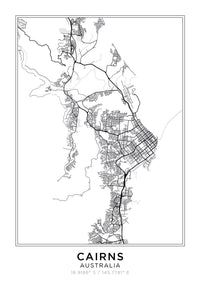City Map | CAIRNS - Art Print, Poster, Stretched Canvas or Framed Wall Art, Showing White , Black, Natural Frame Colours, No Frame (Unframed) or Stretched Canvas, and With or Without White Borders
