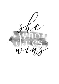 She Who Dares Wins - Art Print, Poster, Stretched Canvas or Framed Wall Art, Showing White , Black, Natural Frame Colours, No Frame (Unframed) or Stretched Canvas, and With or Without White Borders