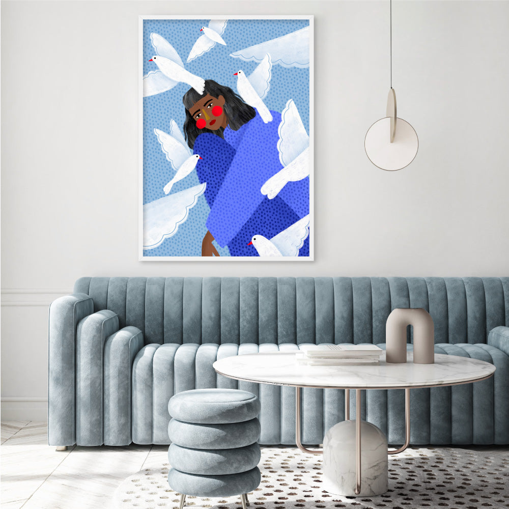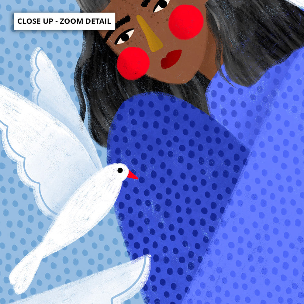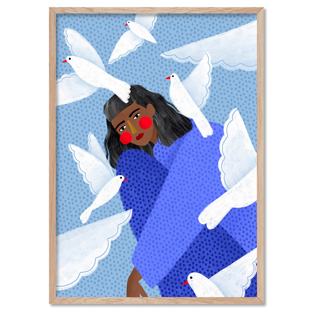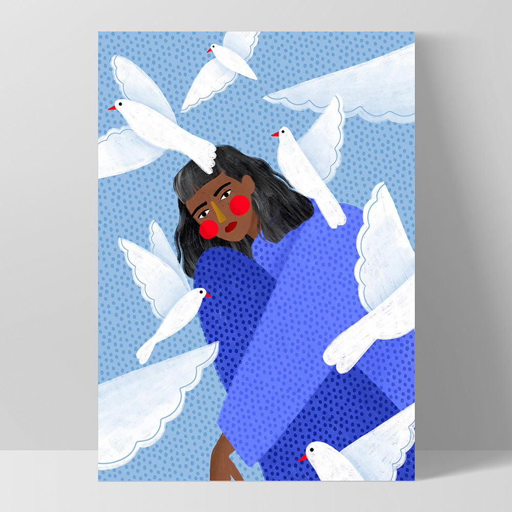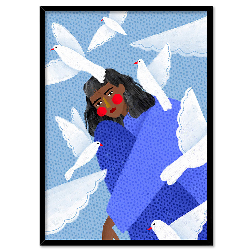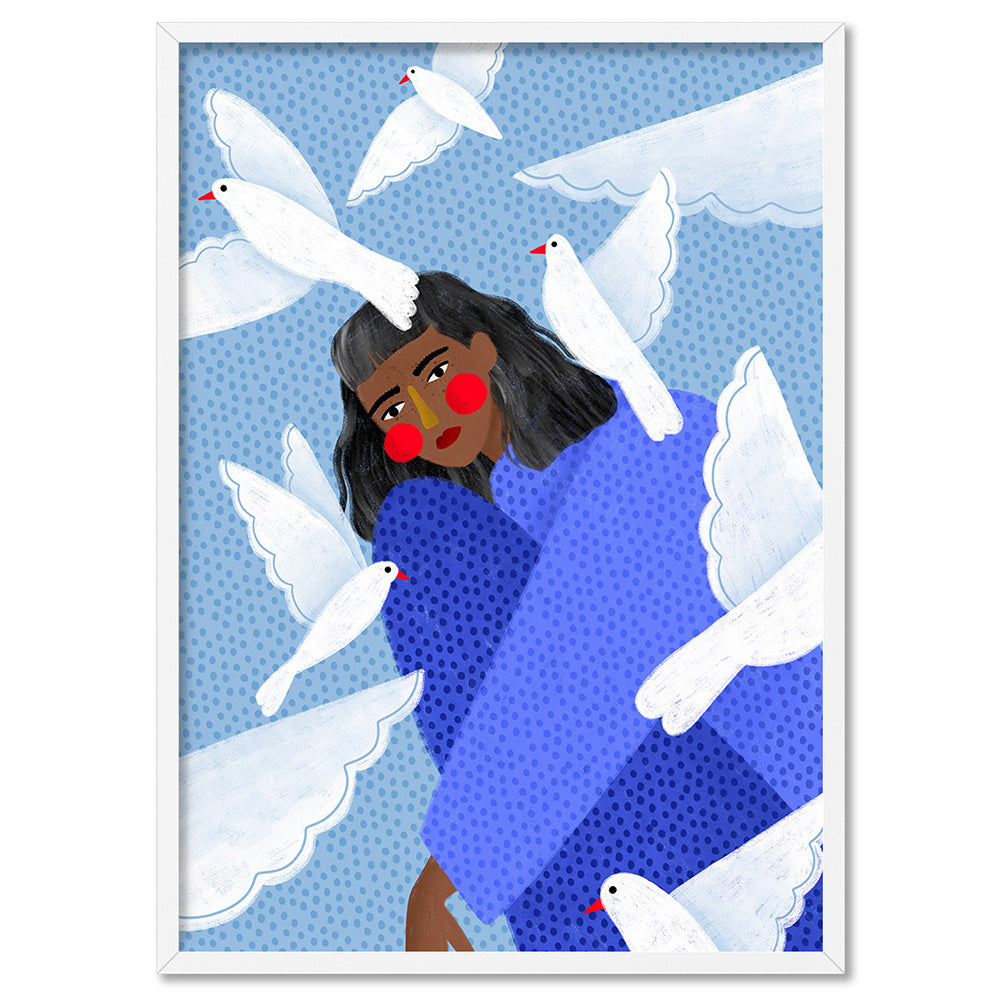 The Woman in Blue with White Doves - Art Print by Bea Muller